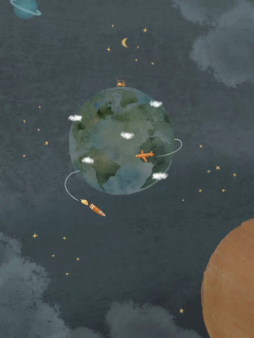 Stoere canvas poster van de wereldbol in het heelal. Je ziet meer planeten en een raket en vliegtuig in de ruimte.