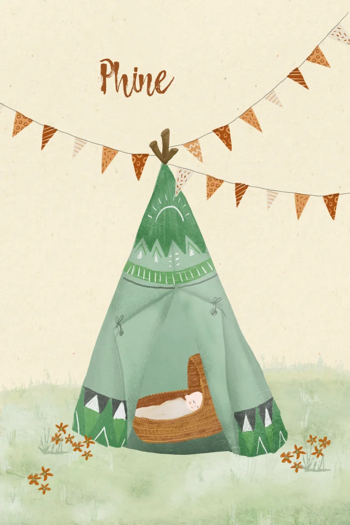Duurzaam geboortekaartje Phine met baby in een mandje in groene tipi. Feestelijke vlaggetjes en bloemetjes in roestbruin
