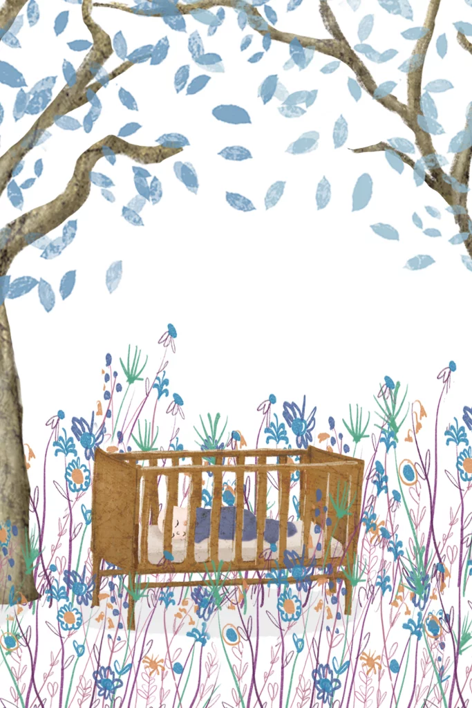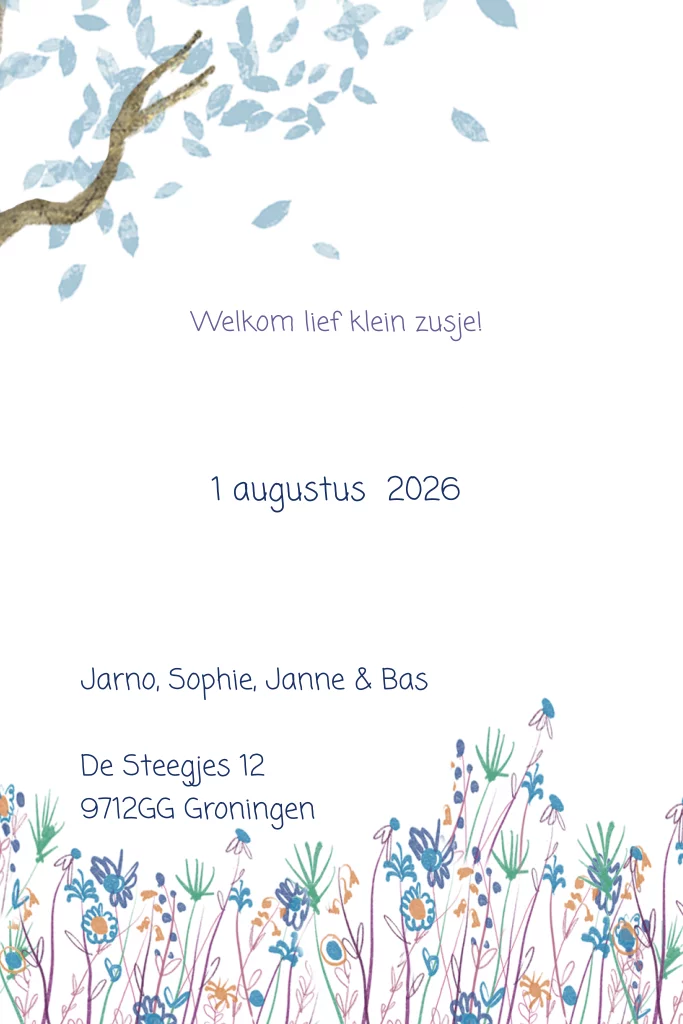 Geboortekaartje ledikantje in blauwe bloemenweide