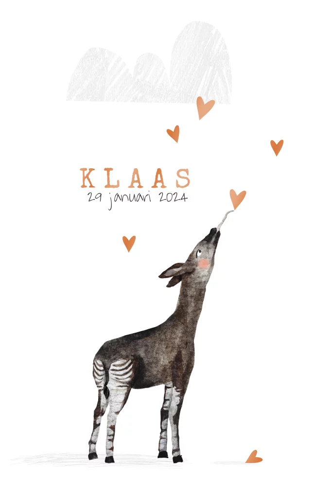 Op dit geboortekaartje Klaas regent het glinsterende hartjes en de okapi likt ze op. Chique en grappig lief kaartje voor jongens en meisjes. Je kunt de foliebedrukking zelf kiezen in de editor.