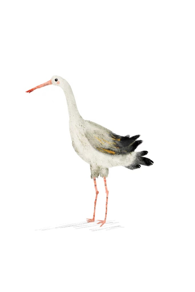 Babykaartje met staande ooievaar en glinsterend hartje van folie