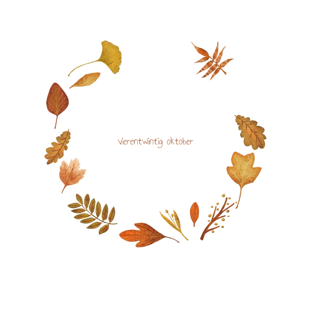 Herfst geboortekaartje Frenkie met bladerkrans van getekende herfstblaadjes. Dit kaartje heeft koperfolie en ronde hoeken; simpel en sophisticated...