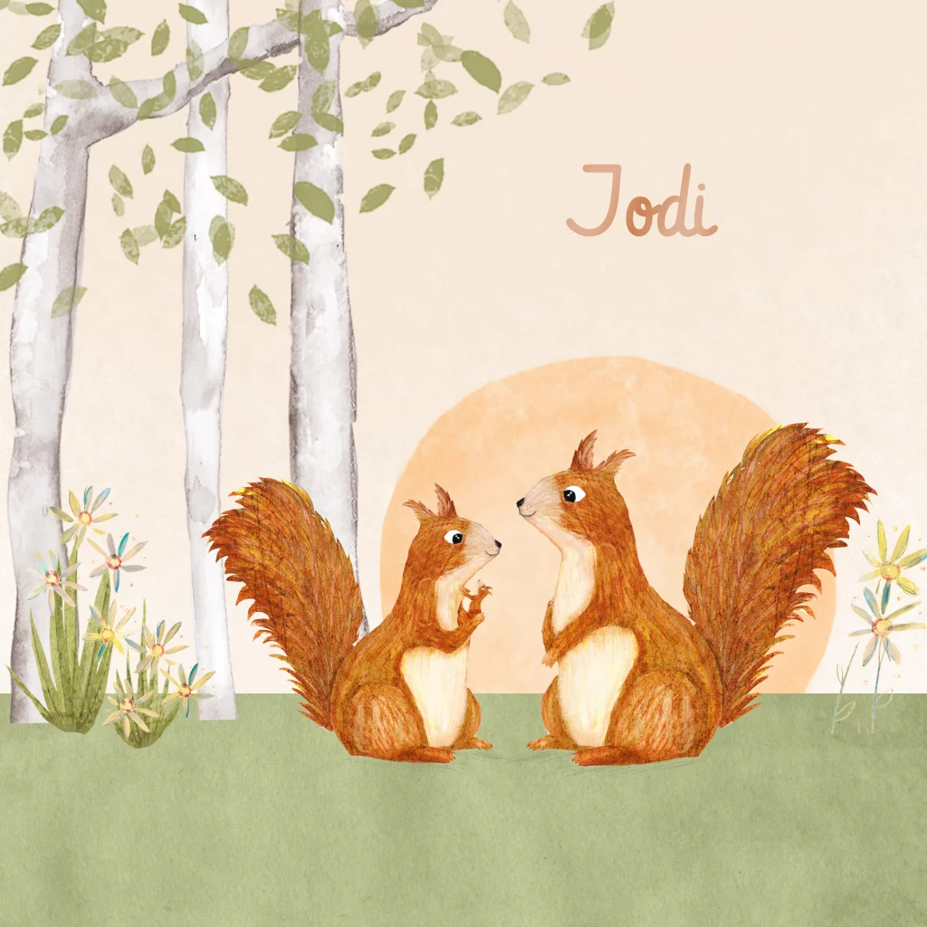 Getekend geboortekaartje met baby eekhoorn in het bos met een opkomende zon en mooie zalmroze en olijfgroene kleuren.