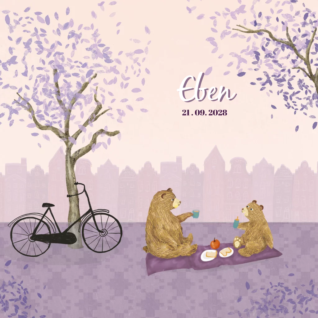 Geboortekaartje Eben met een beren picknick in het park, roze gekleurde lucht en Geveltjes. Een mooi kaartje als er een broertje of zusje op komst is.