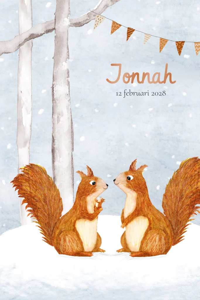 Geboortekaartje Jonnah met eekhoorntjes met baby in de sneeuw in het bos.