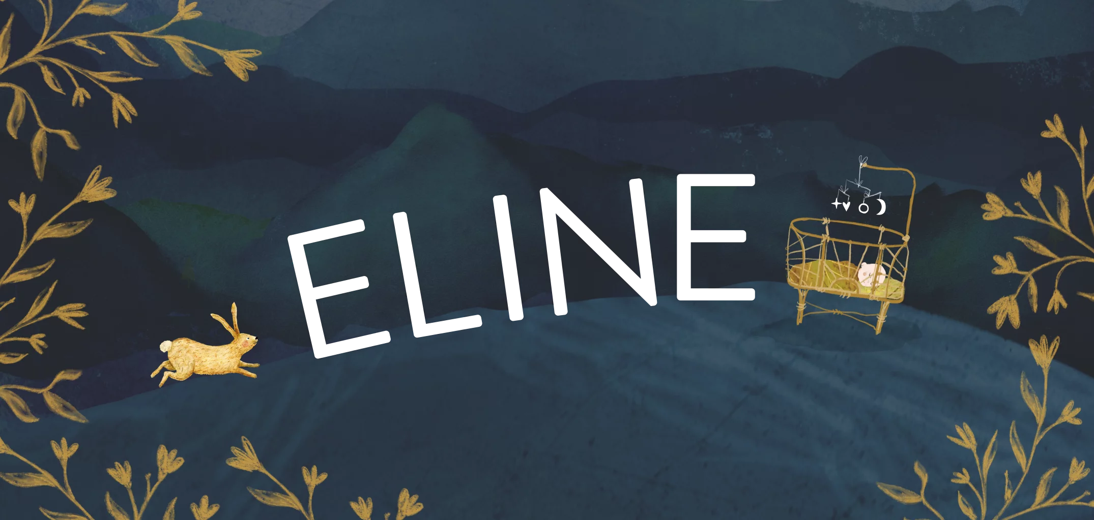 Bijzonder geboortekaartje Eline met grote letters in goudfolie dat mooi afsteekt tegen de donkerblauwe heuvels. Een nieuwsgierig konijntje komt kijken naar het babytje in het wiegje met okergeel.