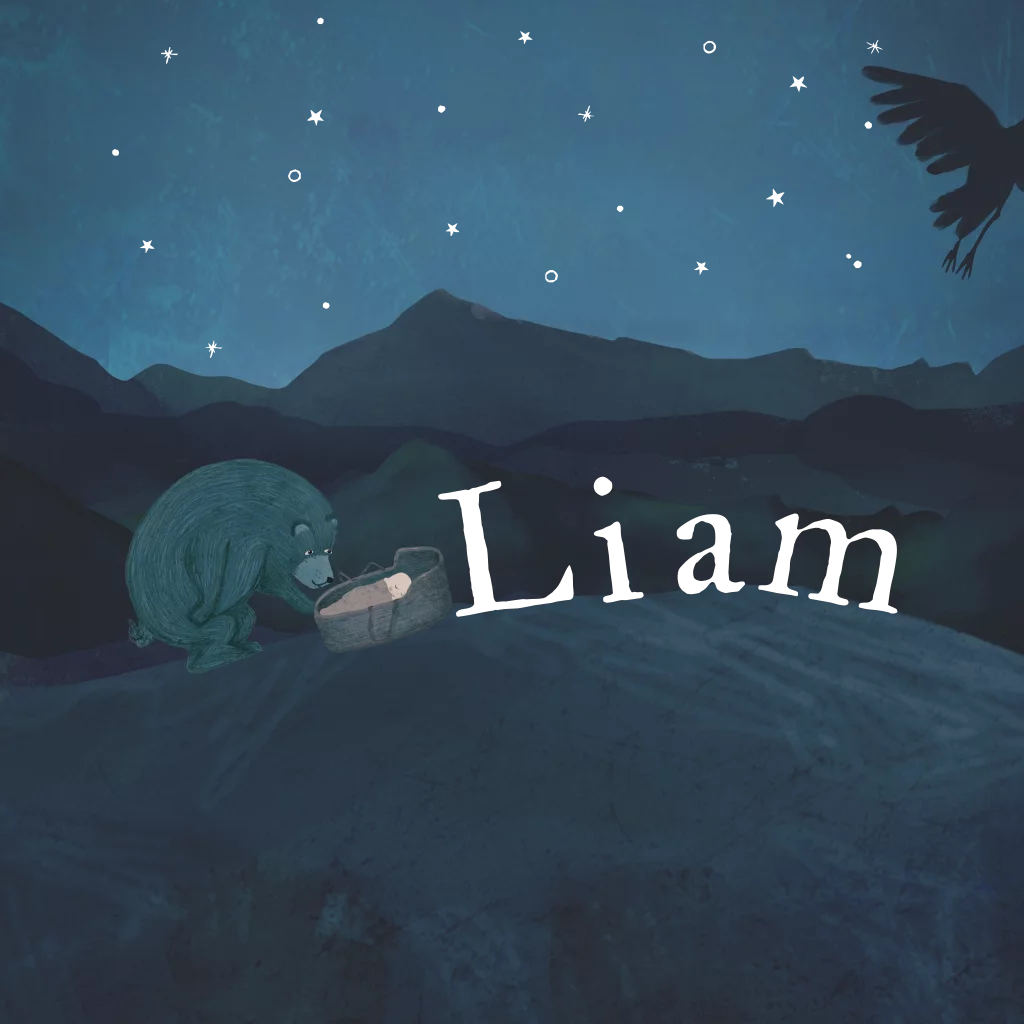 Geboortekaartje met een baby in een mandje met een beer onder de sterren in de donkerblauwe heuvels bij nacht. Met grote letters in goudfolie.