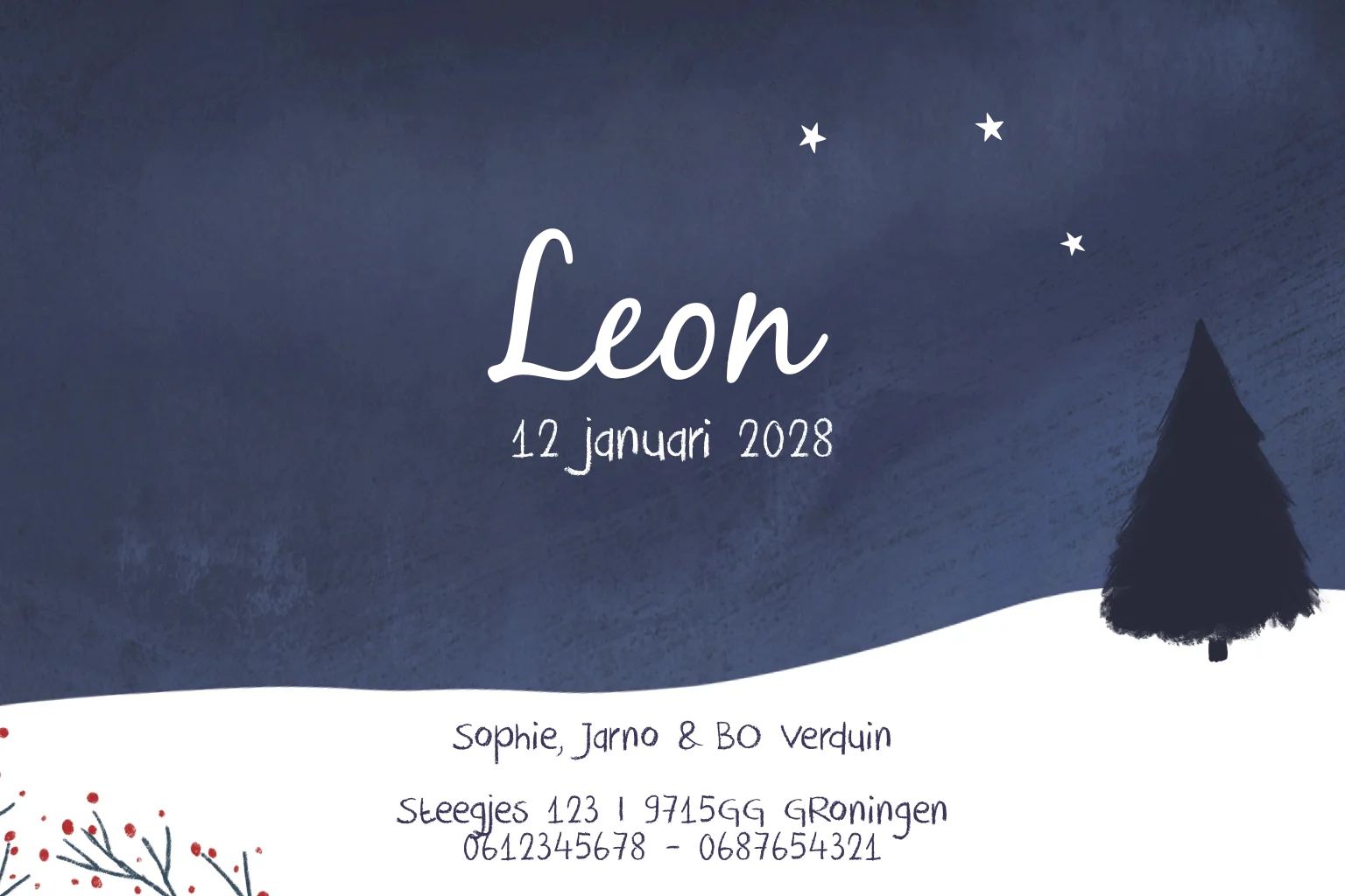 Geboortekaartje Leon met een tekening van een kindje op de slee in de sneeuw, en bosdieren die naar het sterrenbeeld in goudfolie kijken.