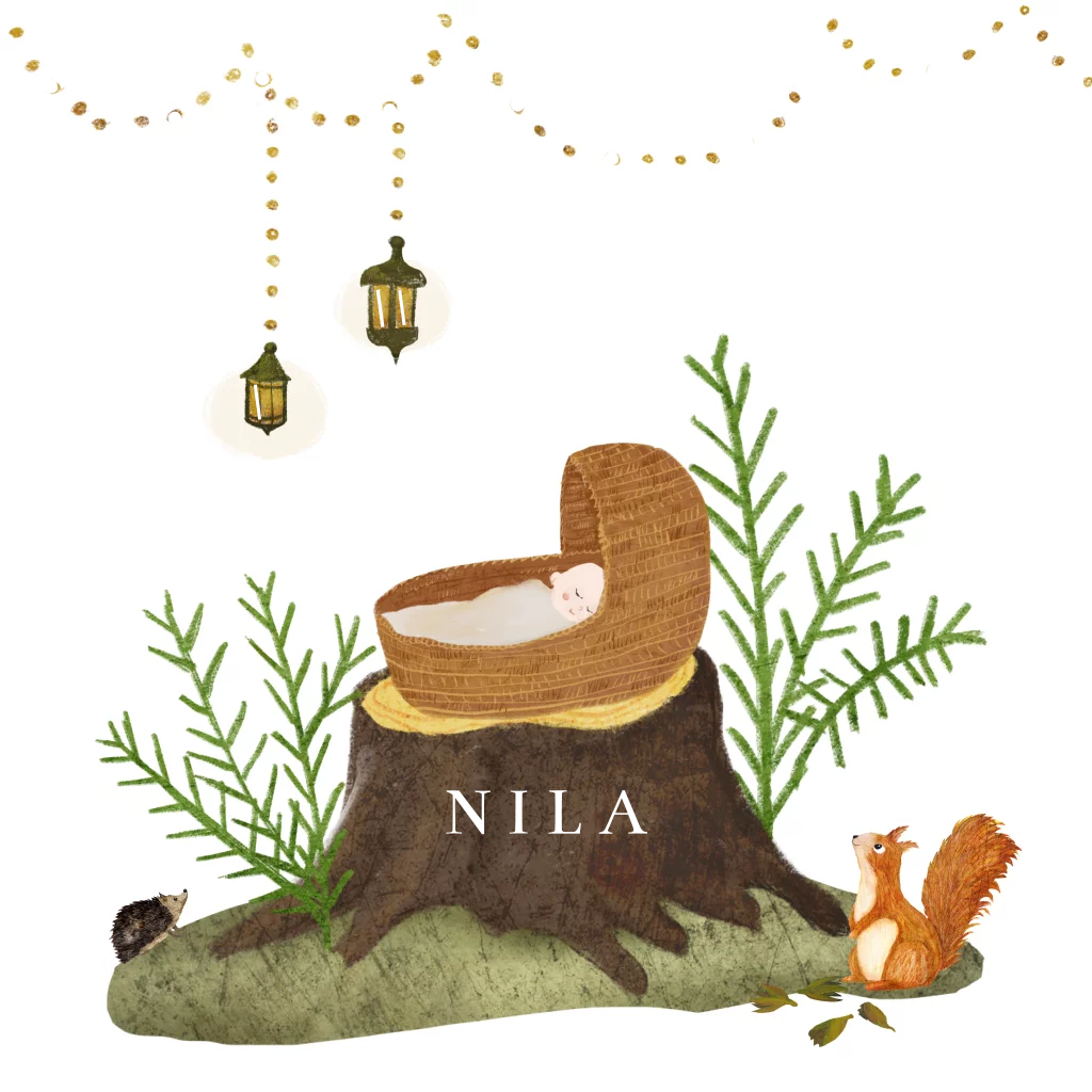 Lief geboortekaartje Nila, met een baby in een wiegje in het bos op een boomstronk met een egel en een eekhoorntje en lataarntjes die licht geven.