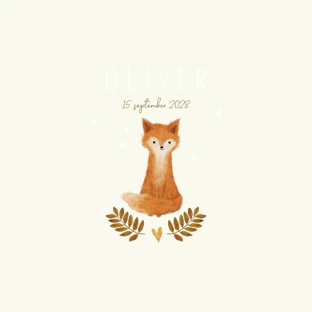 Rustig geboortekaartje Oliver met een tekening van een vosje, met herfstblaadjes en gouden hartjes.