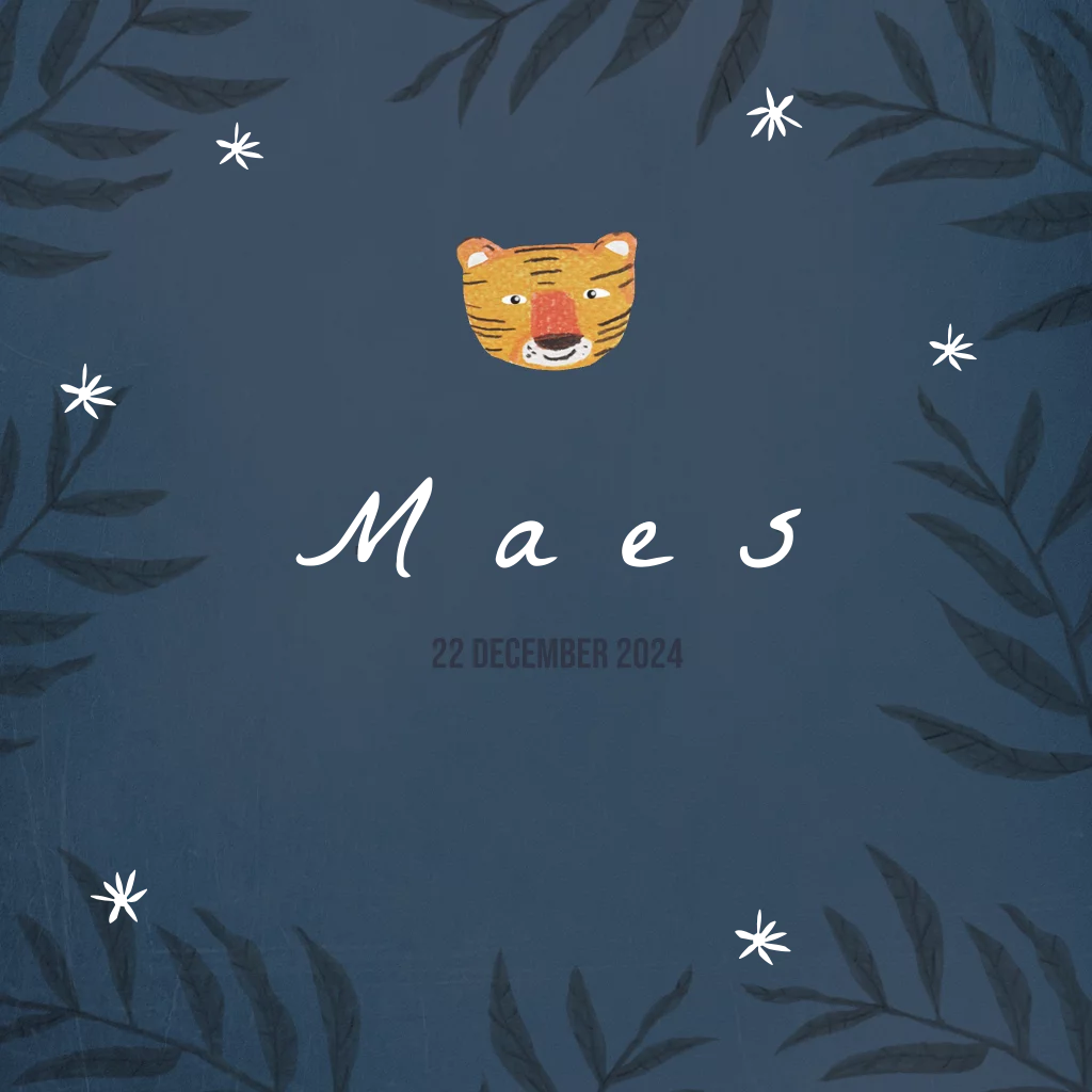 Bijzonder geboortekaartje Maes met tijgerkop en enkele foliebedrukking. Je kunt de kleur folie eenvoudig aanpassen. Kom je er niet uit, of wil je liever een dubbele kaart? Stuur me een berichtje!