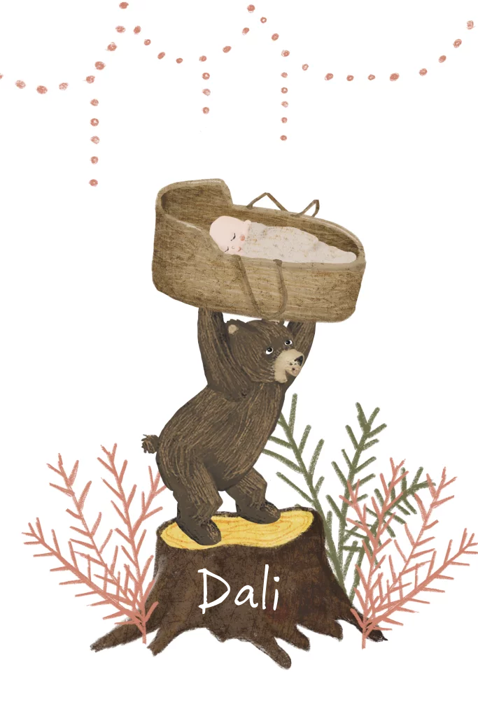Lief geboortekaartje Dali, met heel blij beertje die een baby in een mozesmandje boven zijn hoofd draagt in het bos op een boomstronk. De ketting en de hartjes en tekst zijn in rosefolie.