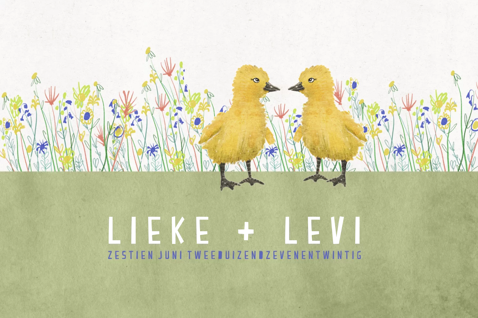 Tweeling geboortekaartje Lieke en Levi met 2 kuikens in bloemenveld met blauw, groen en rood en hippe holografische folie.