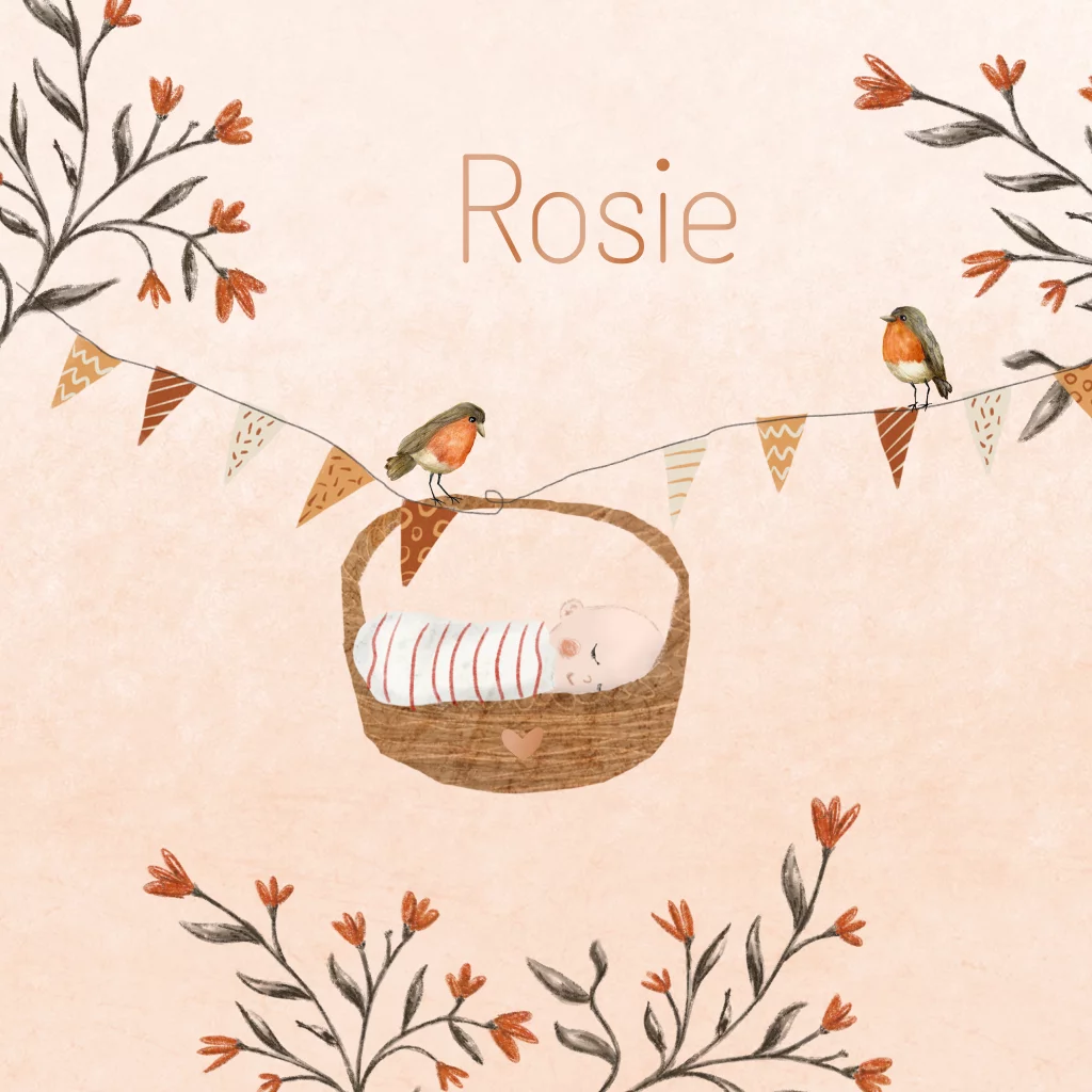 Lief geboortekaartje Rosie, met een baby in een mandje aan een slingertje met roodborstjes en takjes. Een lief herfst geboortekaartje voor jullie kindje.