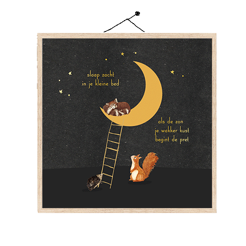 Vierkante poster met de maan en bosdieren in de nacht. Met goudfolie details en een lief gedichtje.