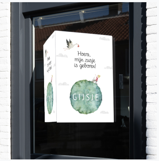 Dubbel raambord met kindje op een driewieler op een wereldbol en ooievaar in de lucht. Hoera mijn zusje is geboren! Je kunt dit bord zelf naar wens aanpassen.