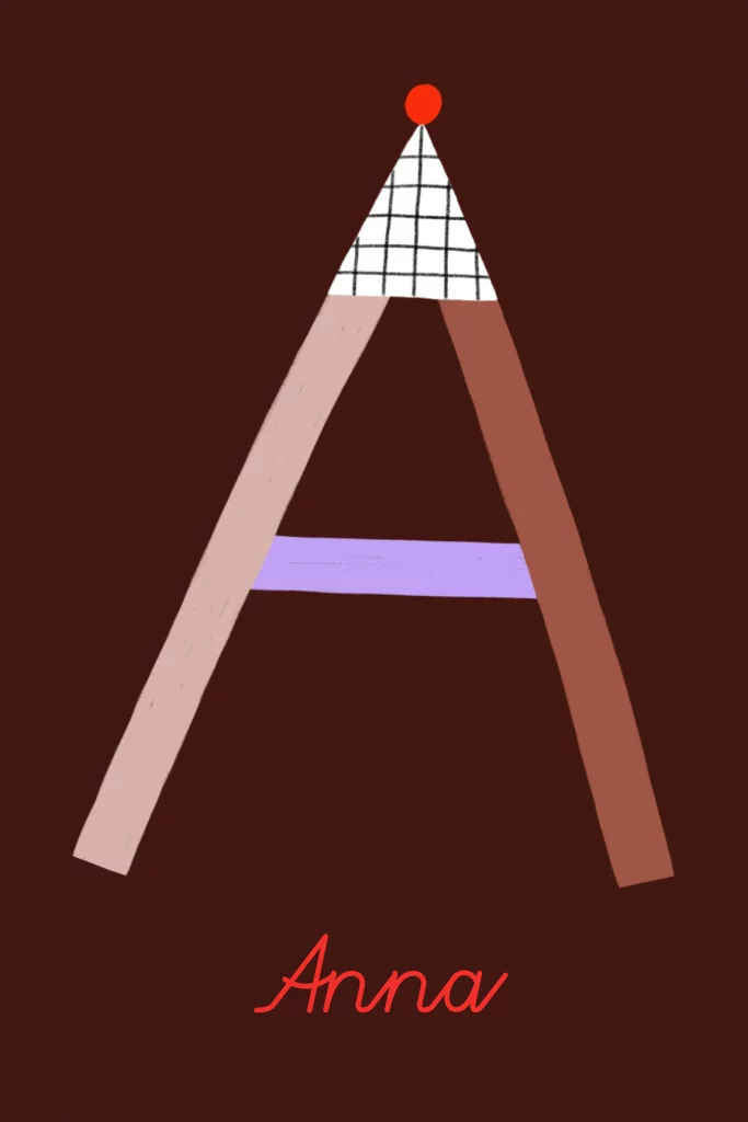 Geboortekaartje met de getekende letter A met een feesthoedje. In de beeldbank vind je het hele geïllustreerde alfabet en grappige illustraties van letters van de illustrator Anna Katharina Jansen