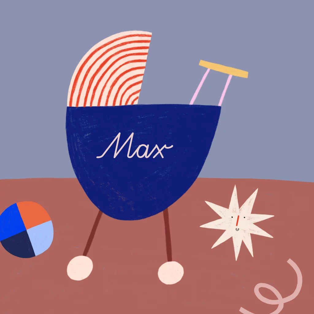 Lief geboortekaartje Max met een getekende kinderwagen tussen het baby speelgoed in neutrale en blauwe kleuren.