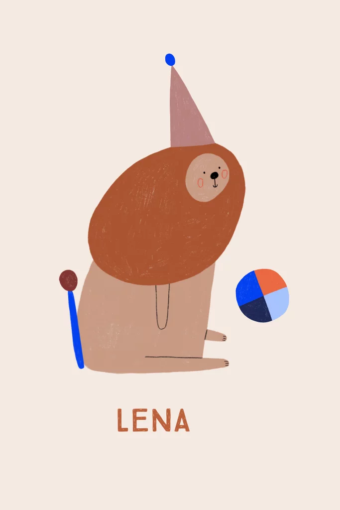 Vrolijk geboortekaartje Lena met leeuw met een feesthoedje op en een gekleurde bal. In de beeldbank vind je meer speelse en grappige illustraties, letters en elementen van de illustrator Anna Katharina Jansen