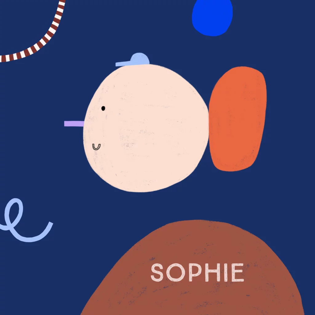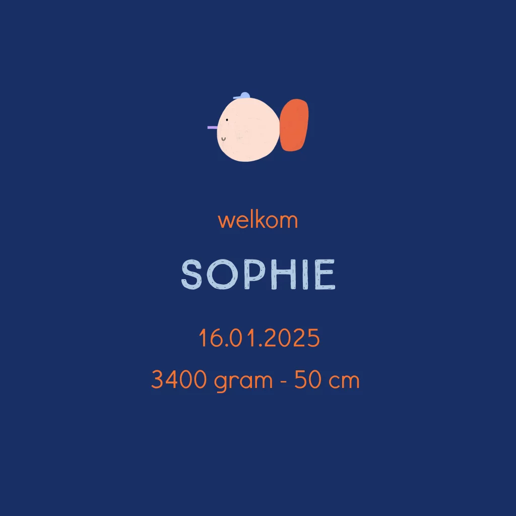 Onderwaterwereld geboortekaartje Sophie met vis en abstracte elementen in vrolijke kleuren op een donkerblauwe achtergrond.