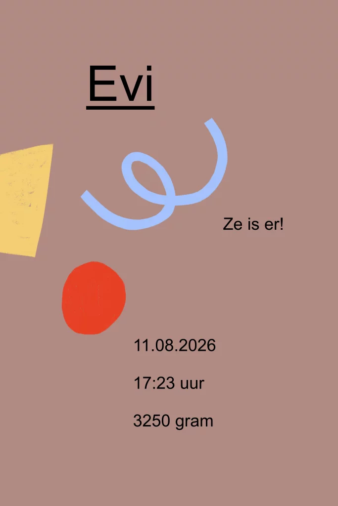 Speels gevouwen geboortekaartje Evi met een trompet en abstracte vormen. Kijk ook eens hoe vrolijk de binnenkant is! Ontwerp van de illustrator Anna Katharina Jansen