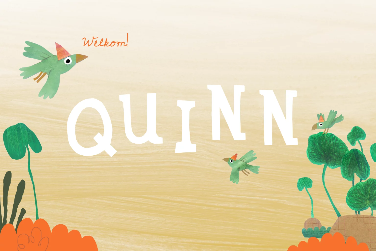 Geboortekaartje Quinn met grote letters en collagestijl vogeltjes met feesthoedjes op een geverfde achtergrond.