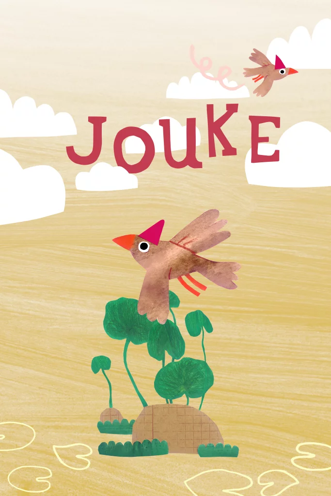Geboortekaartje Jouke van Image de Julie met vogeltjes met feestmutsjes die boven een eilandje vliegen. Bekijk meer illustraties van Image de Julie in de beeldbank via de editor en bewerk zelf!