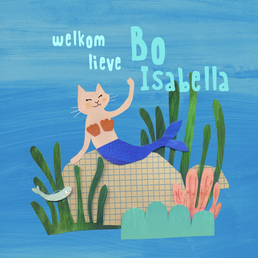 Schattig geboortekaartje onderwaterwereld Bo met een zeemeermin katje en waterplanten in collagestijl.