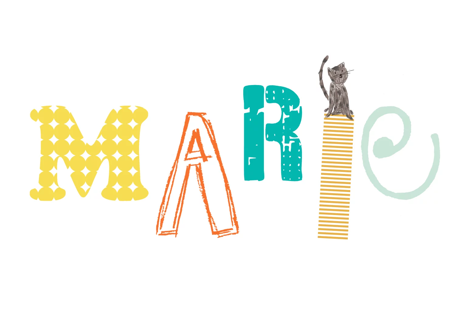 Grappig geboortekaartje Marie met gekleurde letters en een poes