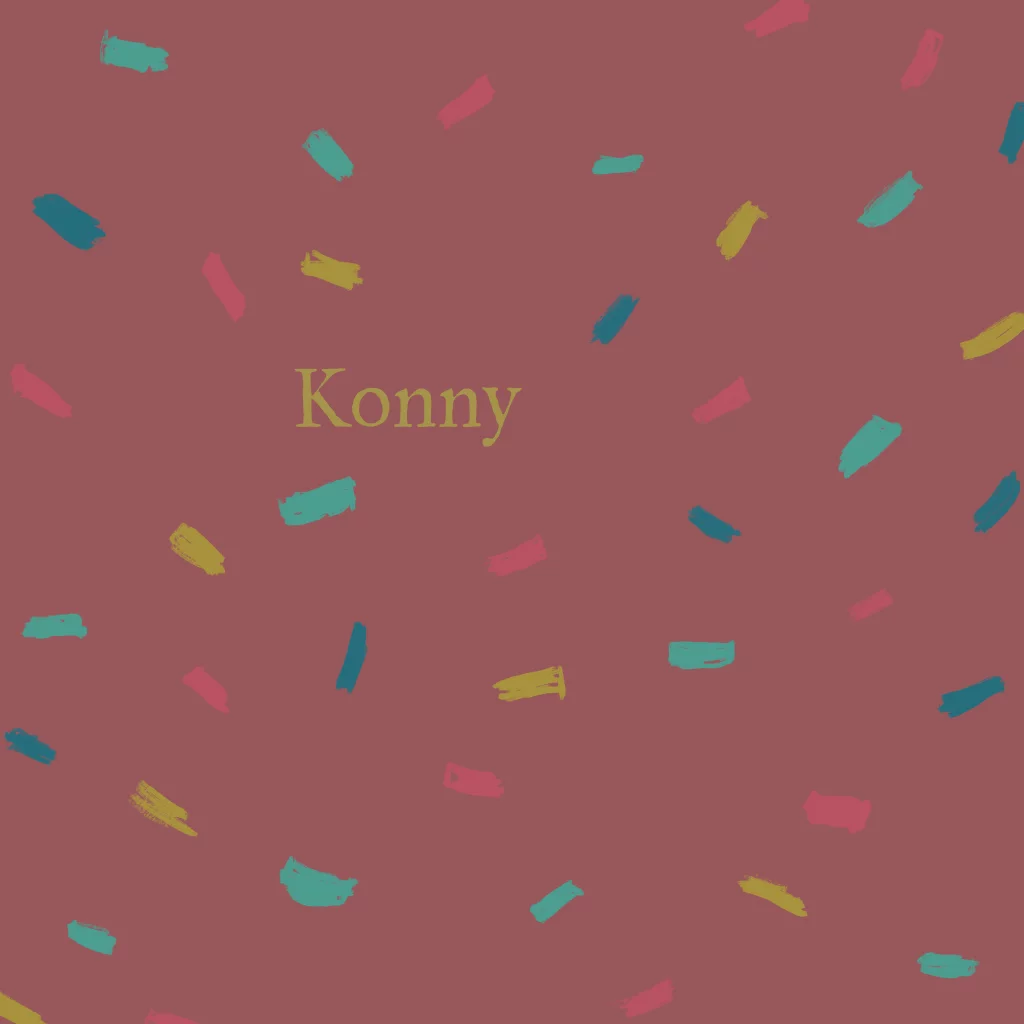 Feestelijk geboortekaartje Konny met confetti in okergeel, bordeauxrood, blauw en groen. studiopie + pindapaard
