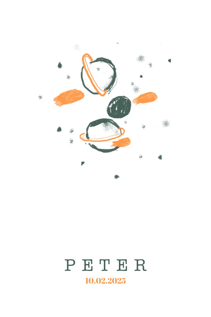 Stoer geboortekaartje Peter met getekende planeten in het heelal, in donkergroen en oranje. Je kunt de kleuren eenvoudig aanpassen.