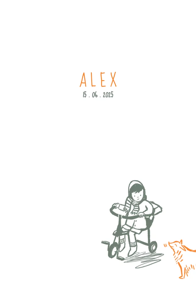 Schattig geboortekaartje Alex met tekening van meisje op een driewieler met een hondje. Je kunt de kleuren veranderen. studiopie + pindapaard