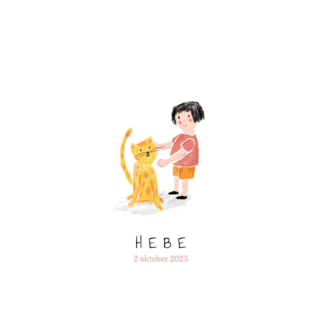 Schattig getekend geboortekaartje Hebe met een meisje die een gele kat, of tijger, aait. studiopie + pindapaard