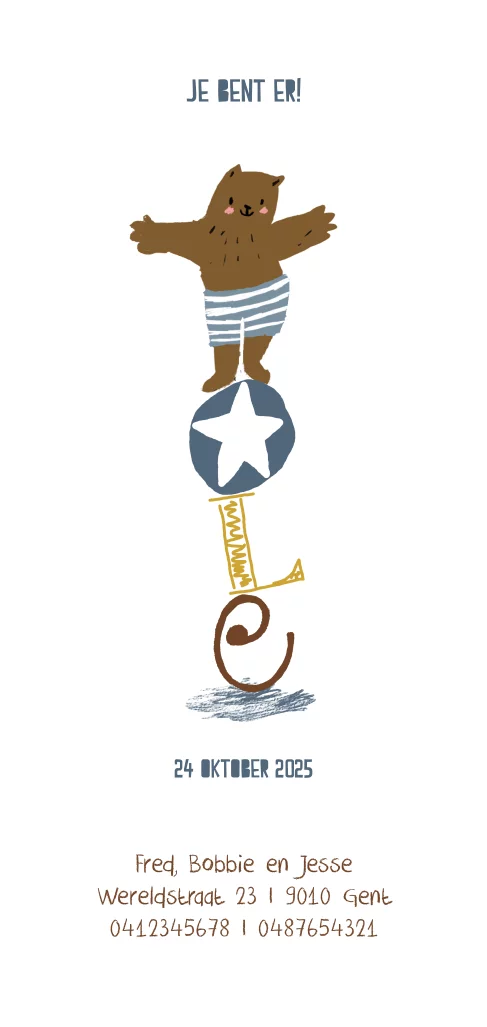 Grappig geboortekaartje met beer die op letters balanceert