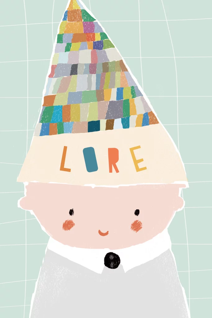 Vrolijk geboortekaartje Lore met een kindje met een feesthoedje op. Je vind verschillende kindjes in de beeldbank. En de achtergrond pas je gemakkelijk aan.