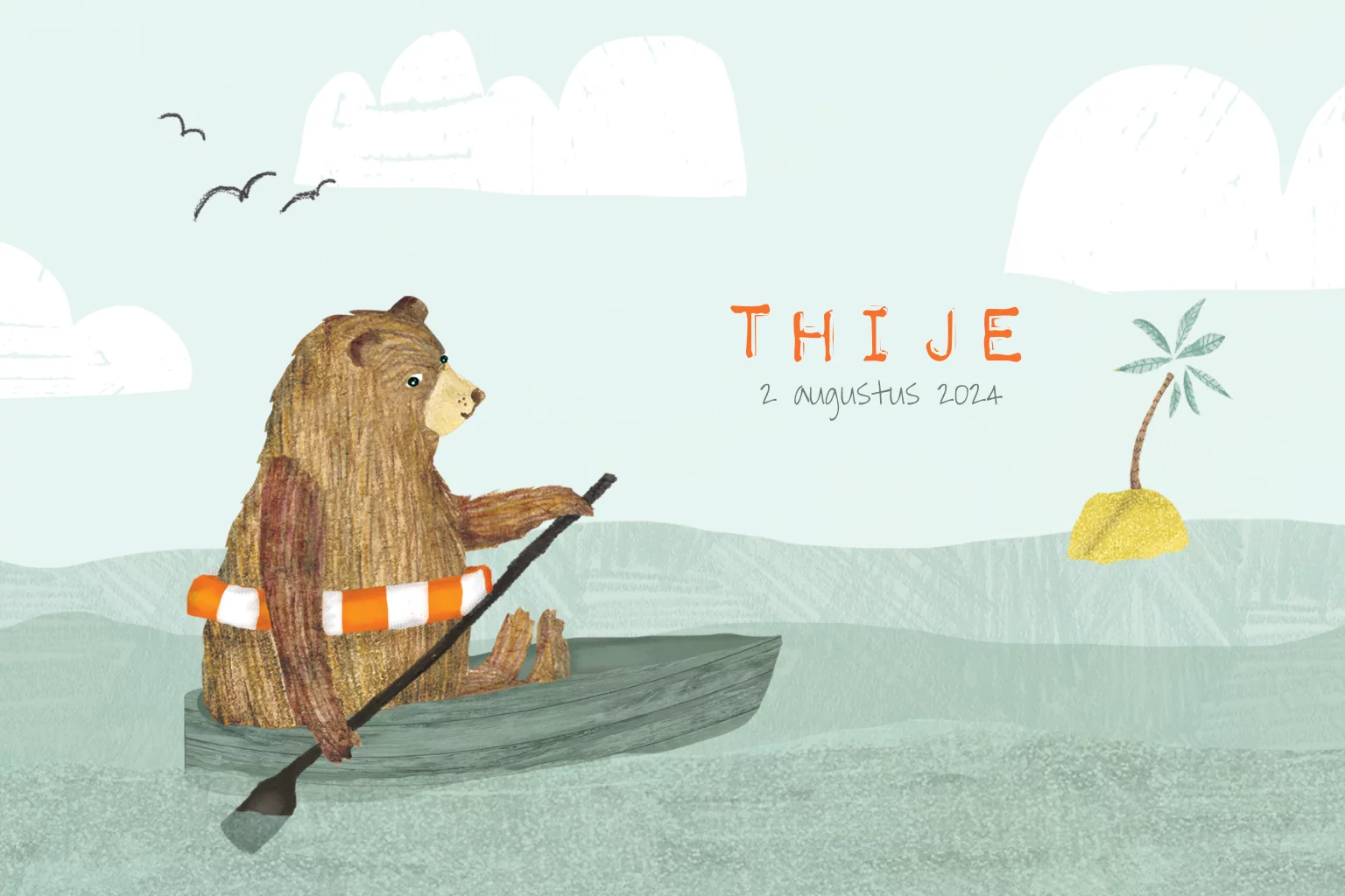 Avontuurlijk geboortekaartje Thije met een beer in een roeiboot en een onbewoond eiland met een palmboom. Lekker tropisch voor zomerse kindjes.