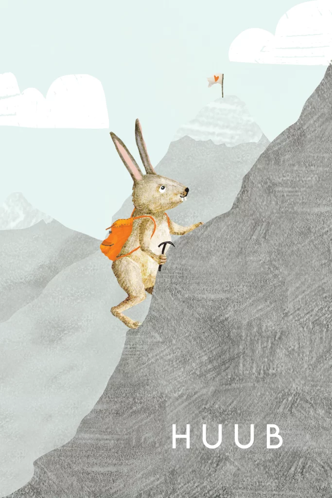 Avontuurlijk en stoer geboortekaartje Huub met een haas die een berg beklimt. Het vlaggetje in de verte kun je verplaatsen.