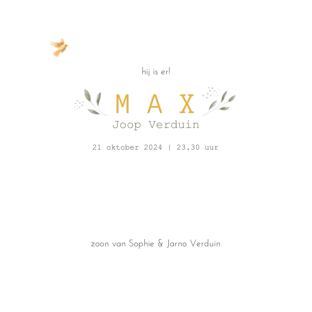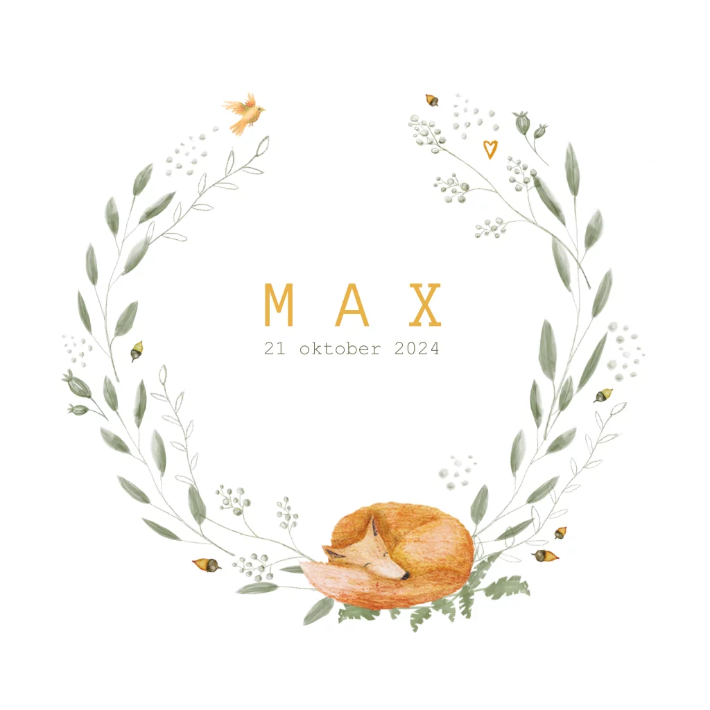 Geboortekaartje Max voor een herfstkindje met een slapend vosje in een krans van blaadjes en eikeltjes. Leuk voor jongens en meisjes.