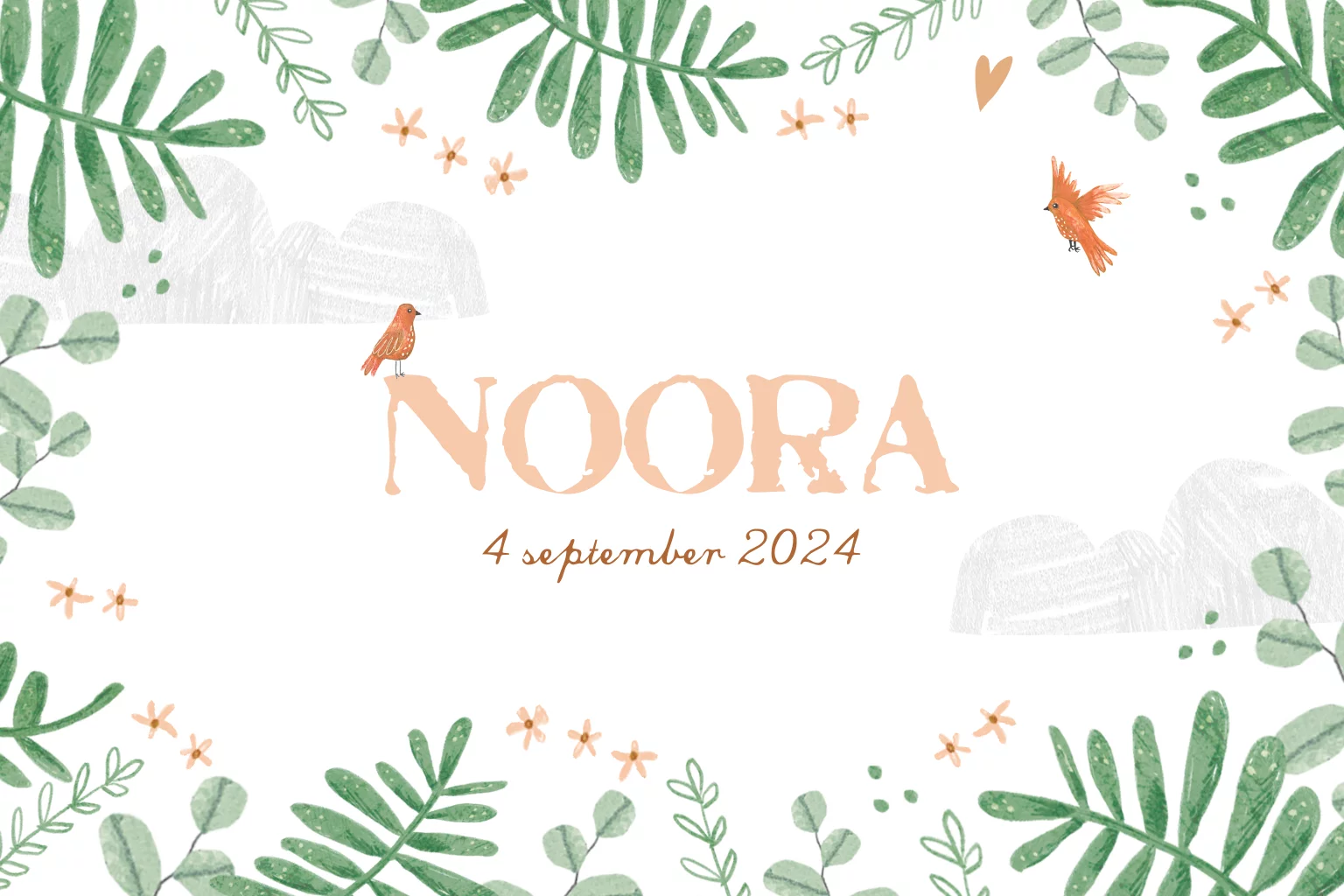 Botanische geboortekaartje Noora met handgetekend jungleblad, kleine bloemetjes en twee tropische vogels. Hippe kleuren als oudroze, olijfgroen en roestbruin maken dit een eigentijds geboortekaartje voor meisjes. Pas zelf eenvoudig de lettertypes en kleuren aan.