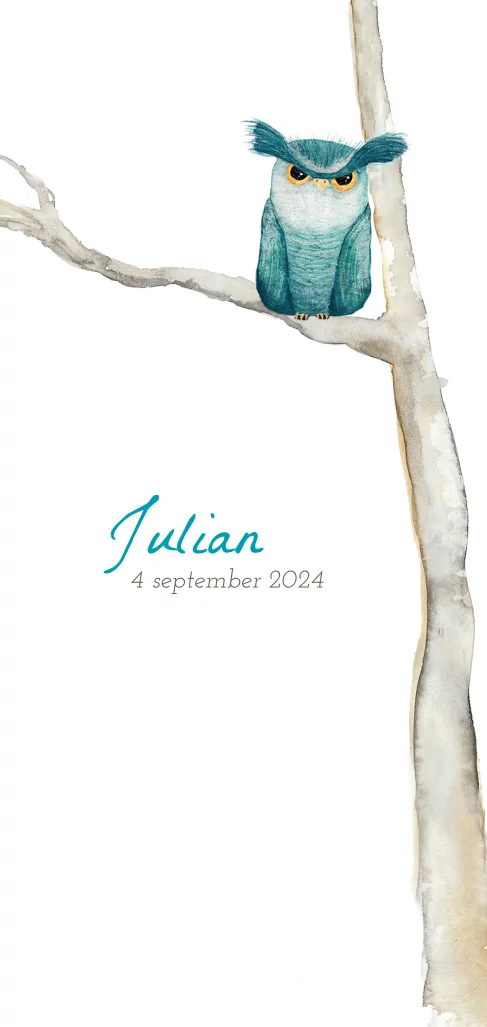 Clean geboortekaartje Julian met een uil in de boom. Pas het lettertype of de kleur aan en maak er je eigen kaartje van!