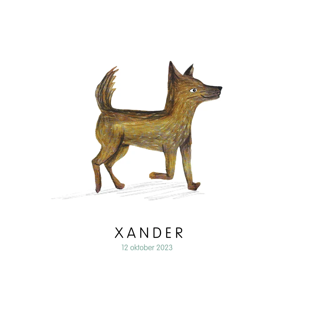 Mooi rustig geboortekaartje Xander met een getekende hond.
