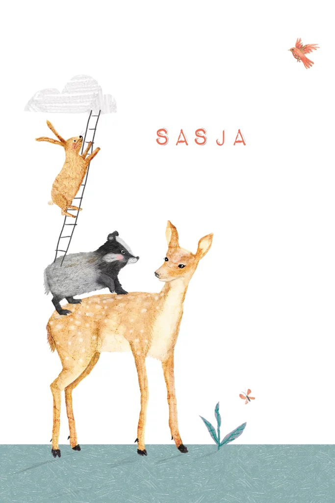 Grappig en lief geboortekaartje Sasja met bosdieren; een hertje een das en een konijntje zijn op elkaar geklommen.