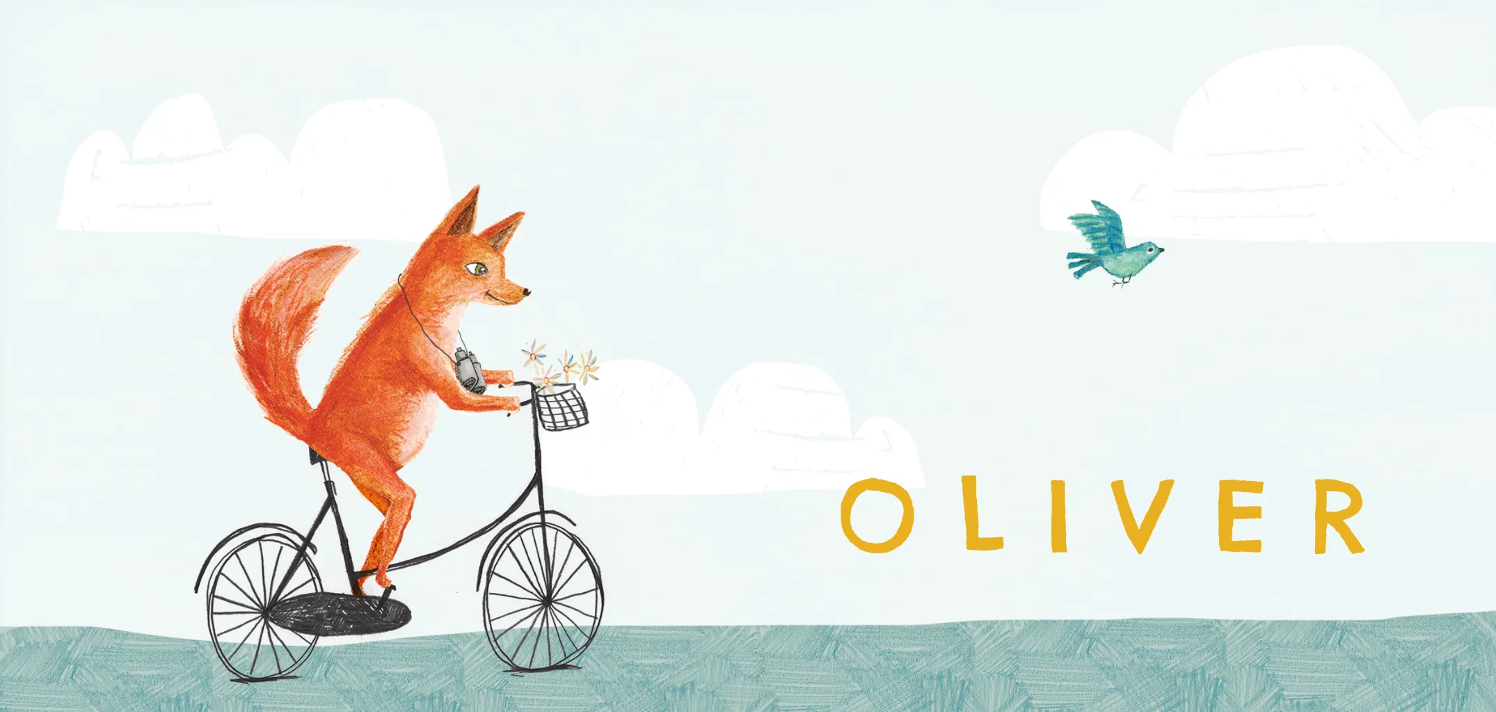 Avontuurlijk geboortekaartje Oliver met vos op fiets, met verrekijker en een vogeltje dat de weg wijst. Pas de teksten eenvoudig zelf aan.