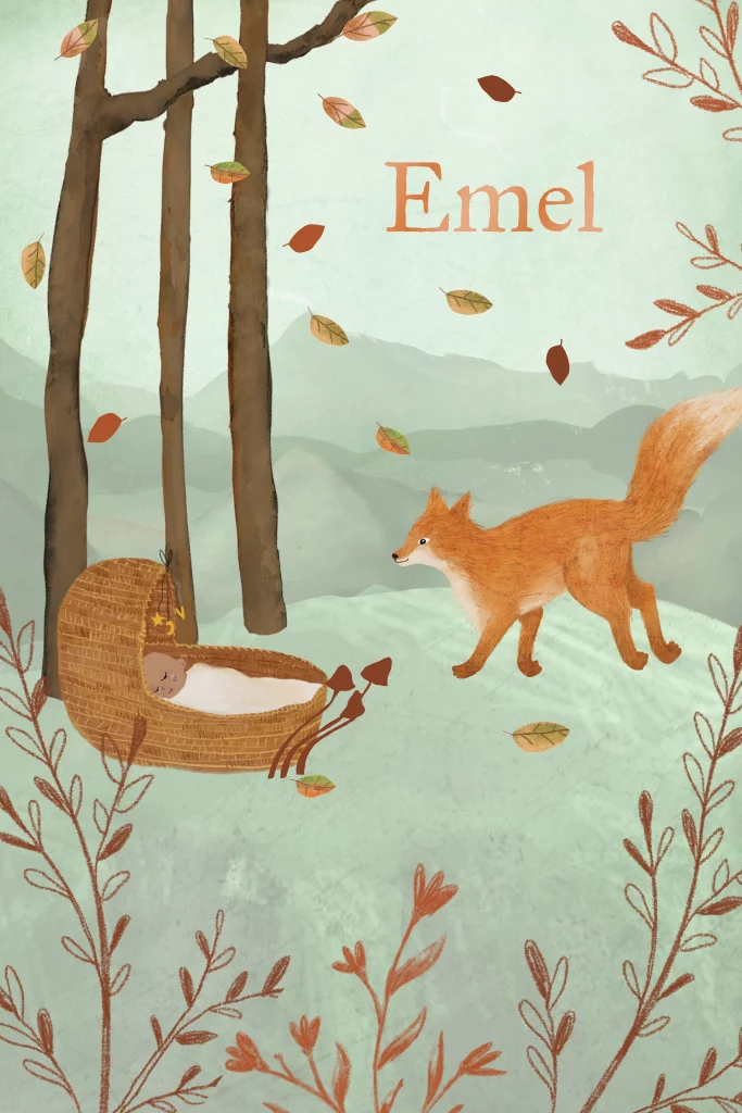 Getekend geboortekaartje Emel met een wiegje in het herfst bos in de bergen en een nieuwsgierig vosje.