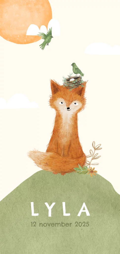Lief geboortekaartje Lyla met een babyvosje met een vogelnestje op zijn kop. Op de achterkant zie je dat de vogel uit het ei gekropen is. Kaartje met mooie kleurencombinatie van olijfgroen en licht oranje.