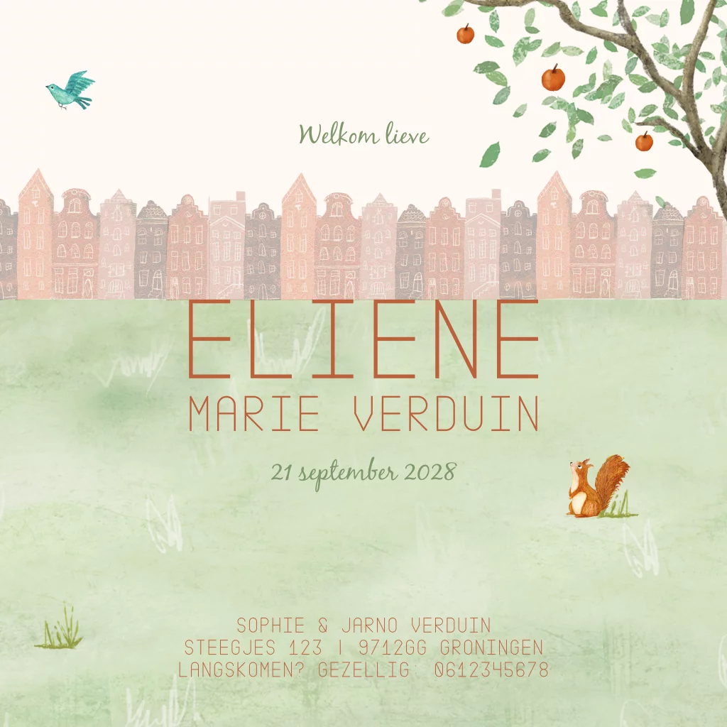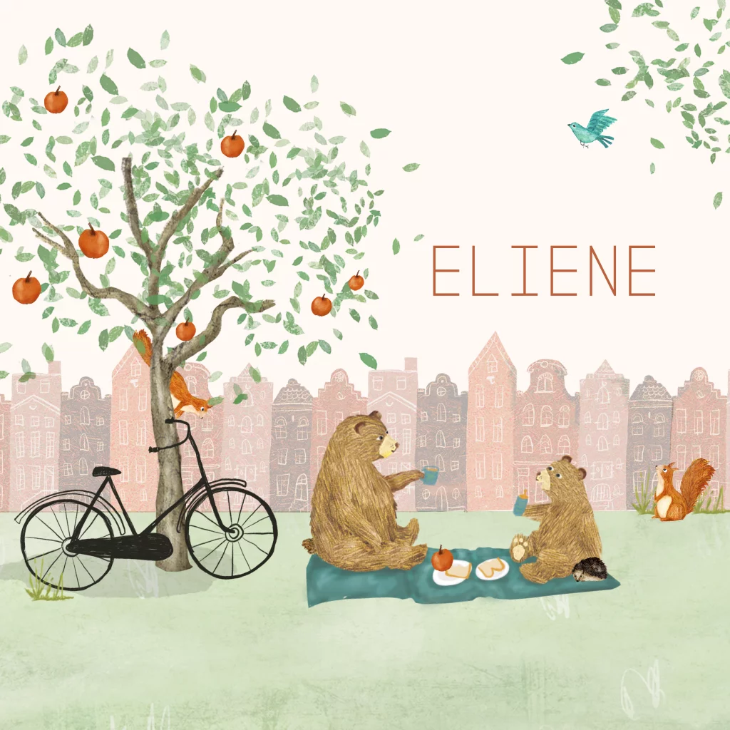 Geboortekaartje met een berenpicknick in het park, met geveltjes op de achtergrond. Lief geboortekaartje voor je zoon of dochter!