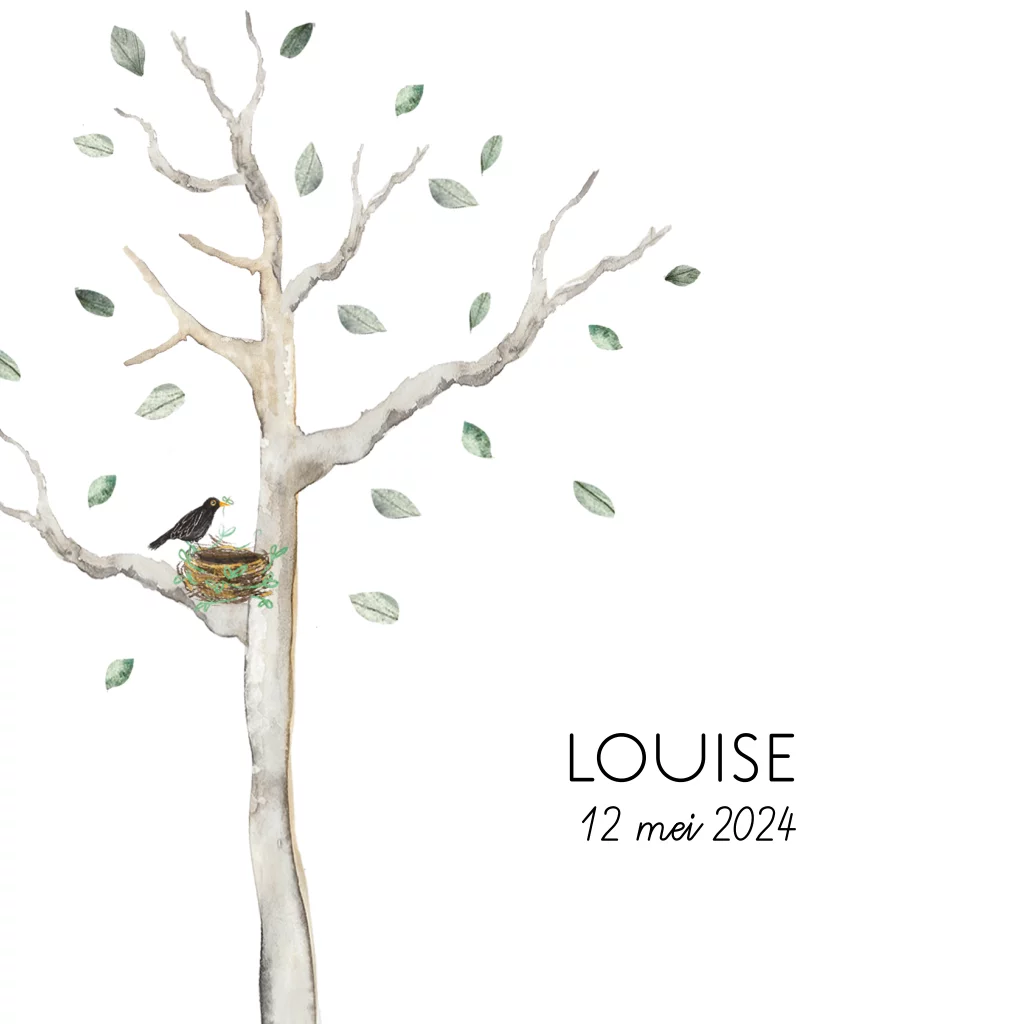 In dit heel eenvoudige rustige geboortekaartje Louise maakt de vogel een nestje in de boom. Mooi voor een lente baby!