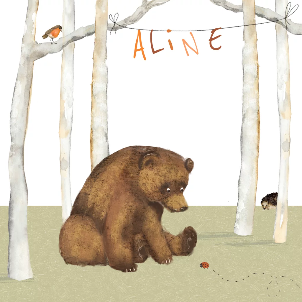 In dit schattige geboortekaartje Aline met herfstige kleuren ziet de beer een klein lieveheersbeestje. Ook het roodborstje en de egel zijn nieuwsgierig geworden wat daar gebeurt. De naam hangt als een vrolijk slingertje tussen de bomen.