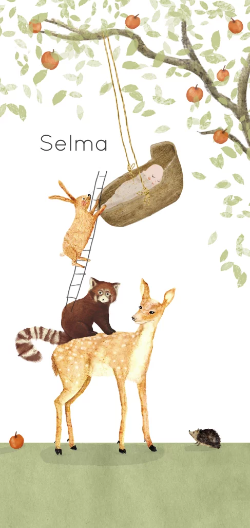 Grappig geboortekaartje Selma met een wiegje in de appelboom en nieuwsgierige bosdieren die met een ladder omhoog klimmen.