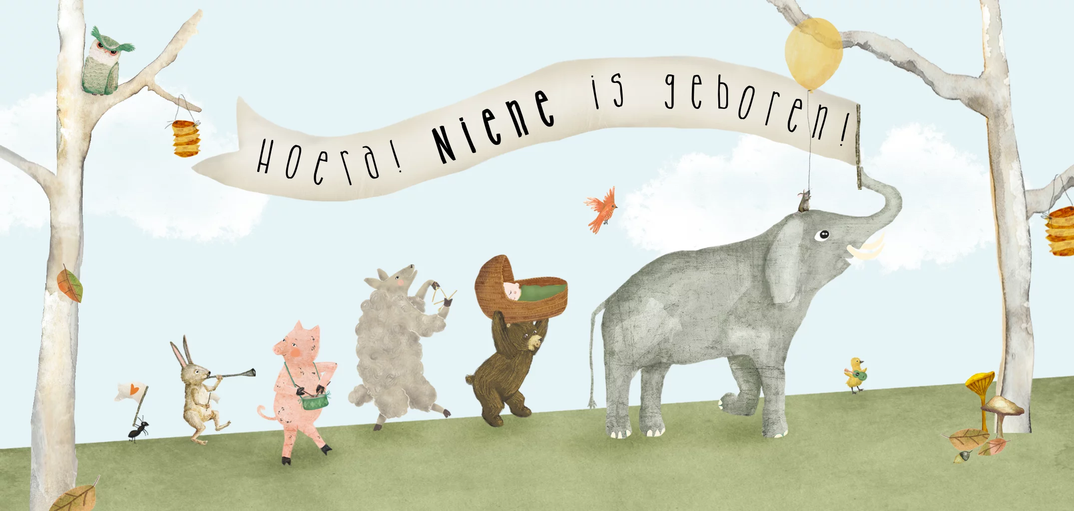 Geboortekaartje Niene met een optocht van dieren. Vrolijk en feestelijk geboortekaartje met dierenparade en een spandoek met de naam van je kindje. Pas de herfstblaadjes aan naar bloemetjes en maak er een zomer of lente kaartje van!